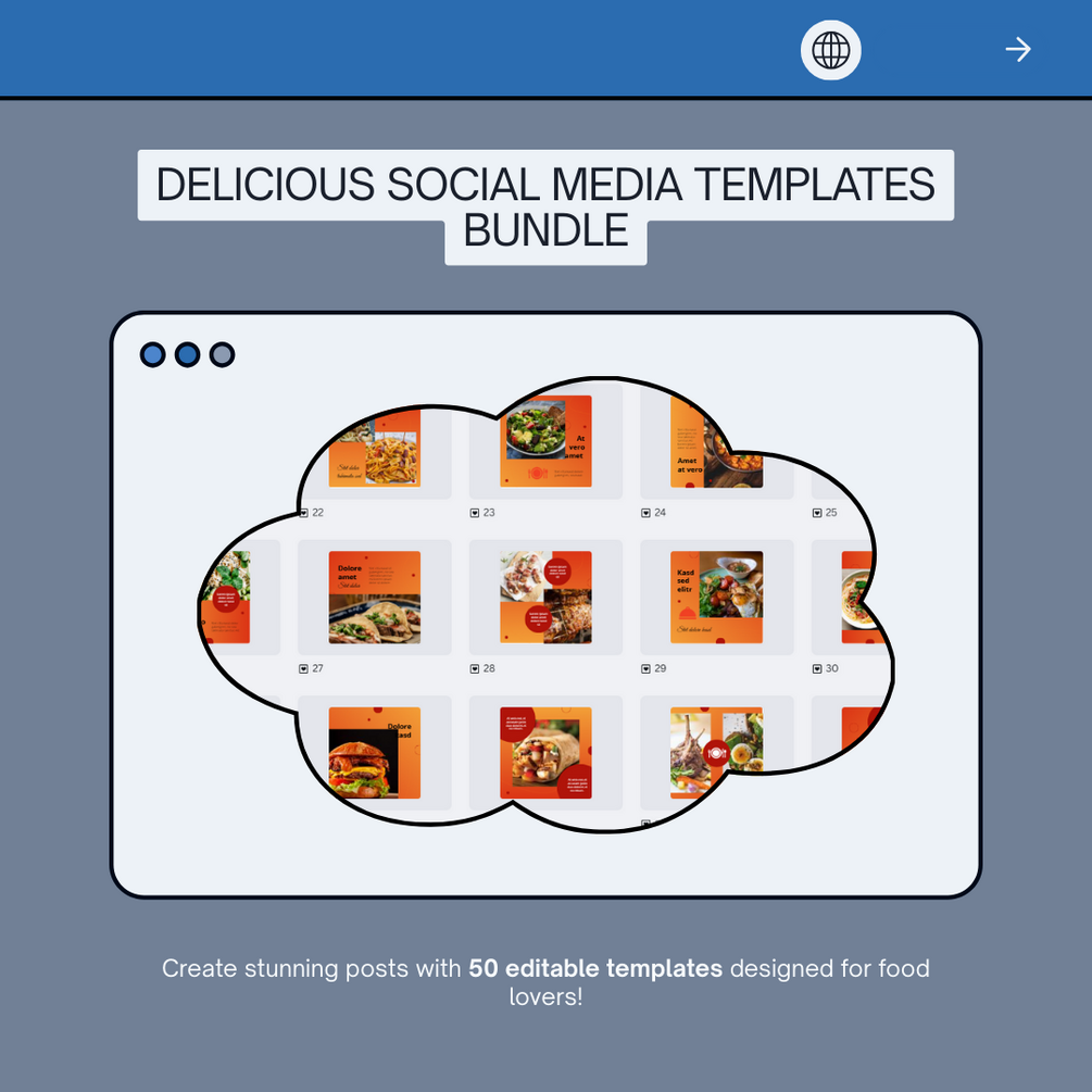 Spice up your social media presence with this delicious bundle of 50 Canva templates tailored for the food industry. Whether you're running a restaurant, food blog, catering business, or a food product brand – these editable templates are perfect to showcase your dishes, recipes, and offers.